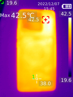 在《原神》運行15分鐘后,我們使用紅外測溫儀來查看手機背部的散熱情況。