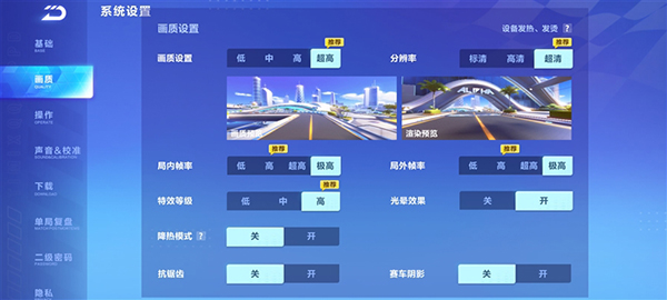 在《QQ飛車》中開啟超高畫質(zhì),我們將分辨率選擇超清,幀率選擇極高。