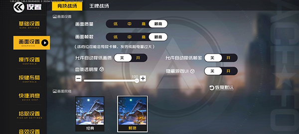 在《王牌戰(zhàn)士》中,我們將競技戰(zhàn)場和王牌戰(zhàn)場的畫面質(zhì)量和畫面幀數(shù)改為最高,允許自動降低畫質(zhì)和幀率關(guān)閉。
