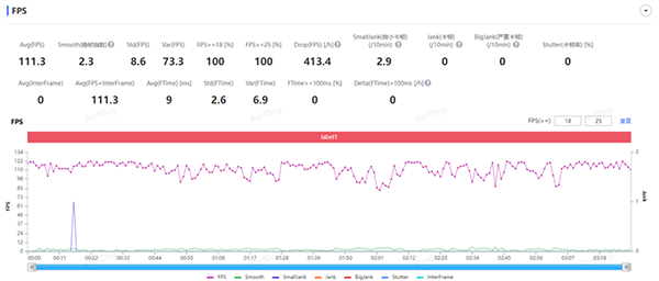 從幀率曲線數(shù)據(jù)圖來看,即便出現(xiàn)波動也并不明顯,很快就回歸到60幀的水平,基準都處于直線的水平。