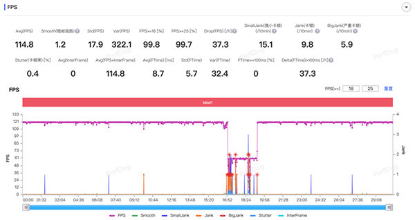 來到《原神》,將畫質(zhì)調(diào)整為極高,幀率為60幀,半小時的須彌野外跑圖打怪測試下來平均幀率為58幀。畫面整體的流暢性不錯,幀率表上也是比較平穩(wěn)的直線,只有在大招全開特效拉滿的畫面才會有卡頓掉幀的情況,也就是說幀率表上的短暫掉幀都是可以預(yù)知的。值得一提的是,游戲持續(xù)到25分鐘后幀率才開始波動,可以說第二代驍龍8移動平臺的性能提升是非常明顯的,最直觀的表現(xiàn)就是帶來更長時間的穩(wěn)幀。
