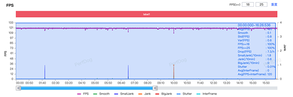 由于中間換局的匹配時間比較長,影響了平均幀率表現(xiàn),因此我們截取了第一場比賽的幀率圖??梢钥吹皆谝痪?6分鐘的游戲里,平均幀率直接來到了120幀,在實(shí)際的表現(xiàn)也非常流暢,特別是在游戲后半局爆發(fā)了一場十人大團(tuán)戰(zhàn),幾乎所有的技能特效都在屏幕中出現(xiàn),但畫面也沒有明顯的掉幀情況,這是比較出乎我意料的。