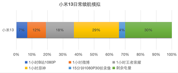 可以看到,在經(jīng)過四小時的重度續(xù)航測試后,小米13從原本的100%下滑至30%,這個表現(xiàn)幾乎是手機市場中的一流水準,當然這也與其6.3英寸的屏幕和1080P的分辨率有著一定關系。為了更加接近大多數(shù)用戶的使用場景,我也將其作為主力機使用了一整天,從系統(tǒng)自帶的電量數(shù)據(jù)圖可以看到,從睡覺前一直使用到第二天下午四點半都還能剩余58%,因此在續(xù)航方面真的不用過于擔心。
