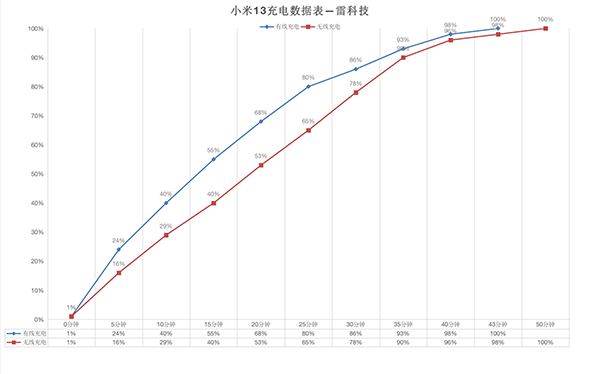 實測小米13的有線充電能夠在10分鐘內從1%充至40%,30分鐘充入86%的電量,43分鐘完全充滿,無線充電則需要50分鐘左右完全充滿。