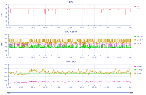 在游戲的測試中,我們選擇了《原神》打開高特效60幀模式,實(shí)測下來半小時(shí)小米13運(yùn)行《原神》的平均幀率可以達(dá)到60幀,平均功耗則是達(dá)到了4.6W,而這時(shí)手機(jī)的溫度實(shí)測邊框最高溫度為39.8℃,背面最高溫度在邊框附近也就在36.6℃。在第二代驍龍8的加持下,小米13可以說是完美征服了《原神》。