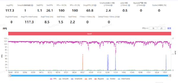 光說(shuō)不練假把式,我們下載了市面上幾款火熱的手游進(jìn)行測(cè)試。首先是《王者榮耀》,游戲內(nèi)開(kāi)啟極限幀率,也就是120幀顯示,測(cè)試場(chǎng)景為實(shí)戰(zhàn)測(cè)試,最終測(cè)試結(jié)束后平均幀率達(dá)到了117.3,在大規(guī)模團(tuán)戰(zhàn)中也鮮有卡頓發(fā)生,體驗(yàn)流暢。