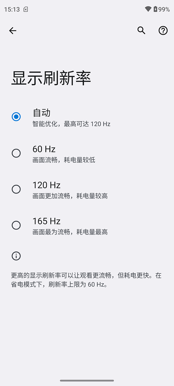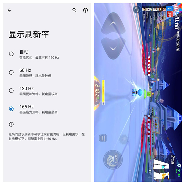在日常的體驗(yàn)中小雷更建議將刷新率設(shè)定為“自動(dòng)”,讓系統(tǒng)根據(jù)不同的場(chǎng)景自行調(diào)節(jié),雖然刷新率上限被限定在120Hz,卻能取得體驗(yàn)和功耗的完美平衡;如果在個(gè)別已經(jīng)適配165Hz的游戲,比如《跑跑卡丁車》、《新笑傲江湖》,則可以開啟165Hz模式,來(lái)獲得更極致的體驗(yàn)。