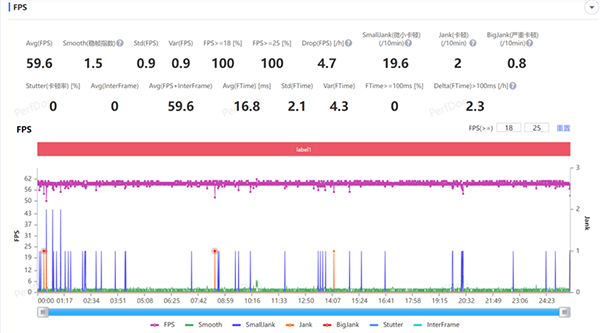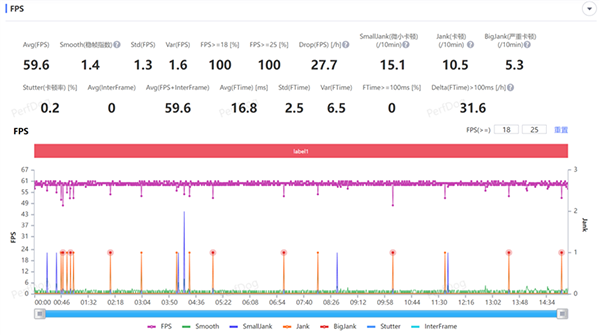其次是中負(fù)載的和平精英手游,在開(kāi)啟HDR高清畫(huà)質(zhì)+極限幀率下,手游以最高60FPS運(yùn)行,經(jīng)過(guò)近25分鐘的游戲測(cè)試,平均幀率維持在59.6FPS,接近滿(mǎn)幀運(yùn)行。