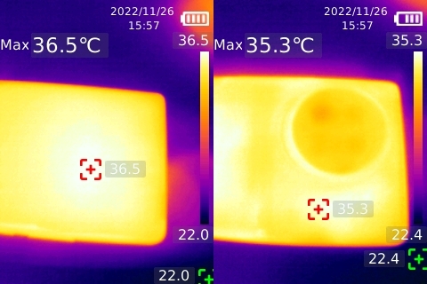 溫度方面,機(jī)身正面最高溫度僅有36.5攝氏度,機(jī)身背面僅有35.3攝氏度。