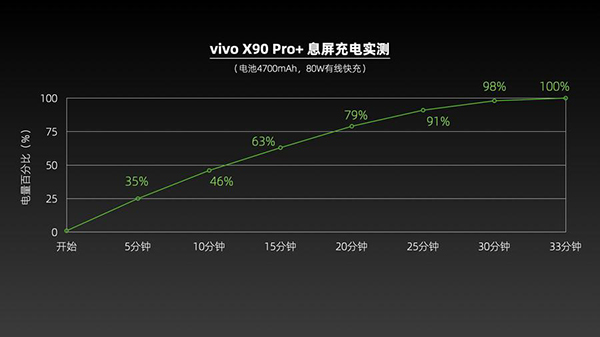 充電方面,官方宣稱33分鐘可充滿。我們也進行息屏狀態(tài)下的復(fù)測,從1%開始進行80W有線充電,未開啟飛行模式僅正常充電,實測的確是33分鐘可完全充滿,vivo沒有任何虛標。其中前10分鐘就充到46%,可見日常碎片化時間補能問題不大。