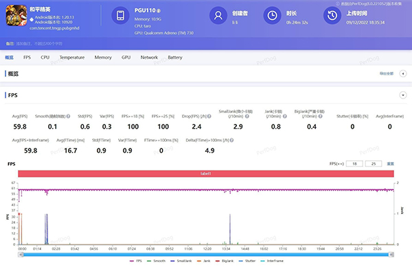 在《和平精英》的測(cè)試中,我們將畫(huà)質(zhì)調(diào)整為最高的HDR高清+極限幀率(60幀)模式,游戲全程平均幀率59.8幀。通過(guò)幀率曲線我們也能看到,游戲全程基本沒(méi)有出現(xiàn)掉幀的情況,不論是在野外趕路還是在城中戰(zhàn)斗,整體體驗(yàn)相當(dāng)流暢。