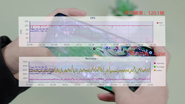 當(dāng)然,咱們還是得看實(shí)際體驗(yàn),屏幕開啟2K分辨率的情況下,王者榮耀120幀超高清模式,半小時(shí)平均幀率為120.1幀,功耗為4.2W,游戲過程中,幀率幾乎是一條直線,反饋到游戲體驗(yàn),無論是團(tuán)戰(zhàn)釋放技能還是對(duì)線,就是絲滑流暢,沒有任何卡頓的感受。