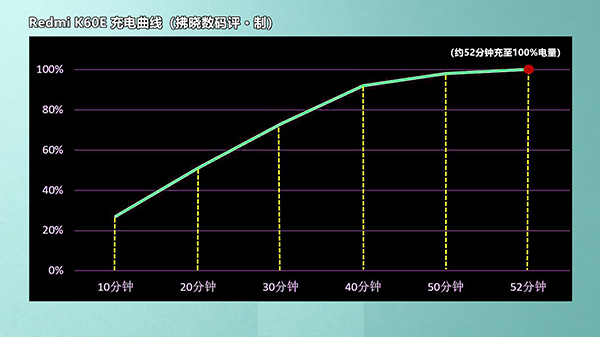 Redmi K60E搭載67W閃充,實(shí)測(cè)5分鐘即可充至19%電量,10分鐘充至33%,最后50分鐘充至100%??梢哉fRedmi K60E在前期能帶來比較快速的充電,到了60%電量后開始放緩,但5500mAh大電池和天璣8200的低功耗表現(xiàn),可以妥妥使用一天不用充電。