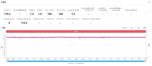 首先是王者榮耀手游,在開啟極高幀率與超高分辨率下,游戲以最高120FPS運(yùn)行,經(jīng)過一局激烈的團(tuán)戰(zhàn)近16分鐘的游戲,整局游戲的幀率穩(wěn)如一條直線,平均幀率維持在119.2FPS,幀率方差穩(wěn)定在1.9。