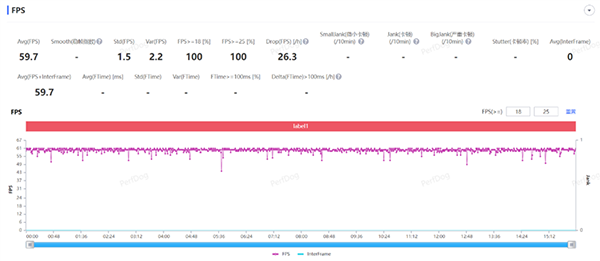 最后是硬件殺手原神,在開啟最高畫質(zhì)+60幀模式下,經(jīng)過近15分鐘的游戲,在打怪放大招時(shí)會(huì)有些許波動(dòng),不過整體的幀率還算比較穩(wěn)定,維持在59.7FPS,幀率方差2.2。