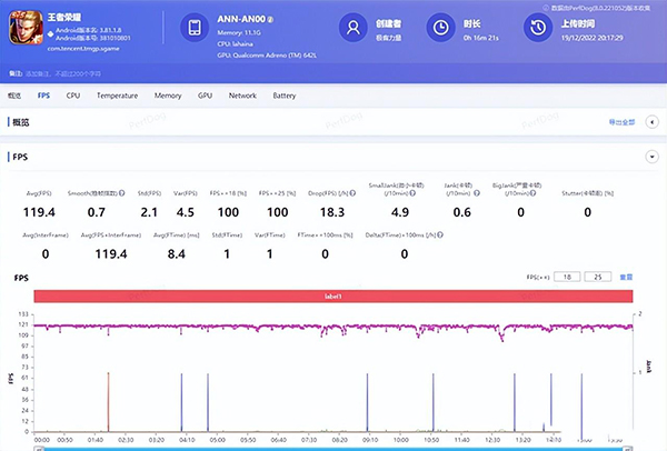 首先是經(jīng)典的競技手游王者榮耀,游戲的圖像預(yù)設(shè)為極高幀率、超高分辨率和高清總畫質(zhì),且開啟抗鋸齒功能。最終通過專業(yè)的性能狗手機(jī)幀率監(jiān)測軟件可以看出,啟用120幀的設(shè)置玩王者榮耀,實際游戲的平均幀率可以達(dá)到119.4,幀率幾乎為一條長直線,而且全程都沒有出現(xiàn)影響游戲體驗的卡頓延遲,整體游戲感覺相當(dāng)暢快。