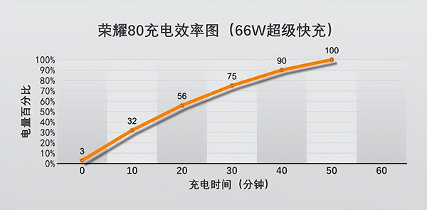 榮耀80內(nèi)置了4800mAh容量電池, 并支持66W有線超級快充以及極速充電模式。從手機僅剩3%的電量時開始充電,10分鐘后電量充至32%,20分鐘電量過半至56%,30分鐘充電量可達75%,充滿整部手機最終用時50分鐘。由此來看,即便是重度手機用戶也無需擔心榮耀80的電量見底,因為僅需通過閑暇的碎片時間充電,就能高效快捷的復(fù)活手機電量了。