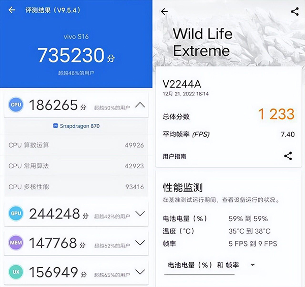 在這個性能方面,vivo S16搭載驍龍870芯片,對這款芯片相信大家都十分熟悉了,雖然發(fā)布時間不短了,但是依然是一款能效比十分優(yōu)秀的芯片,在安兔兔和3D Mark Wild Life Extreme的跑分測試中,vivo S16分別得到73萬分和1233分的成績,在一眾驍龍870產(chǎn)品中應(yīng)該算中上等的水平了。