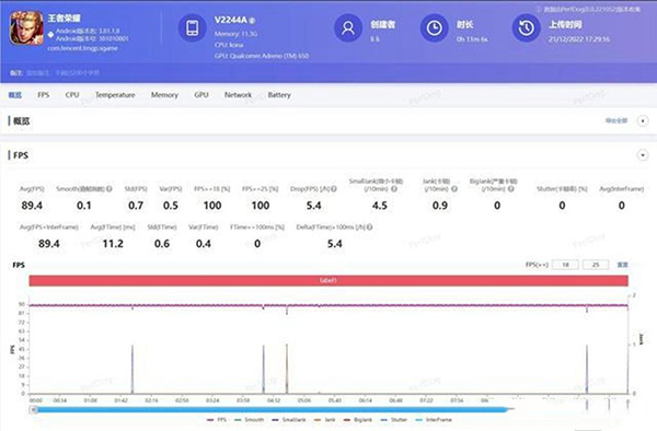 通過《王者榮耀》的測試來看,在90幀超高幀率、超高分辨率、畫質(zhì)特效全開的狀態(tài)下,幀率曲線表現(xiàn)平穩(wěn),平均幀率達到89.4幀,足夠流暢。而且得益于vivo S16內(nèi)置的電競級仿生散熱系統(tǒng),整個測試過程中機身對溫度的控制也相當(dāng)不錯。