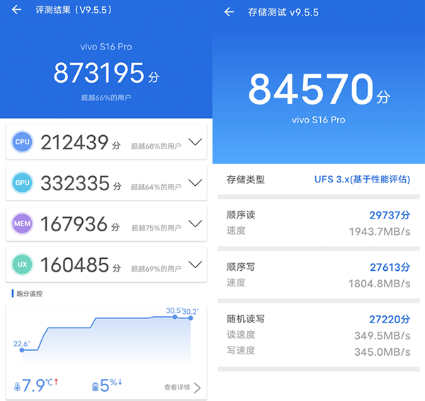 從前幾代(S12系列)開始,vivo的S系列就已經(jīng)開始更為均衡的發(fā)展了,雖然主打自拍美顏,但是其他方面,如性能部分的體驗沒有因此被閹割掉。這次的vivo S16 Pro搭載了性能鐵三角:天璣8200、LPDDR5和UFS 3.1。安兔兔跑分超87W分,存儲測試則是超8.4W分,這個分數(shù)對于日常軟件的安裝、運行、使用都是沒啥壓力的。