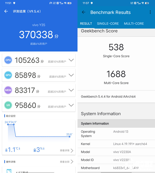 實測跑分,vivo Y35在安兔兔拿到了超37萬的高分,在Geekbench的單核成績?yōu)?38分;多核成績?yōu)?688分。亮眼的跑分成績,意味著vivo Y35的性能在高性價比5G手機市場處于拔尖的位置。