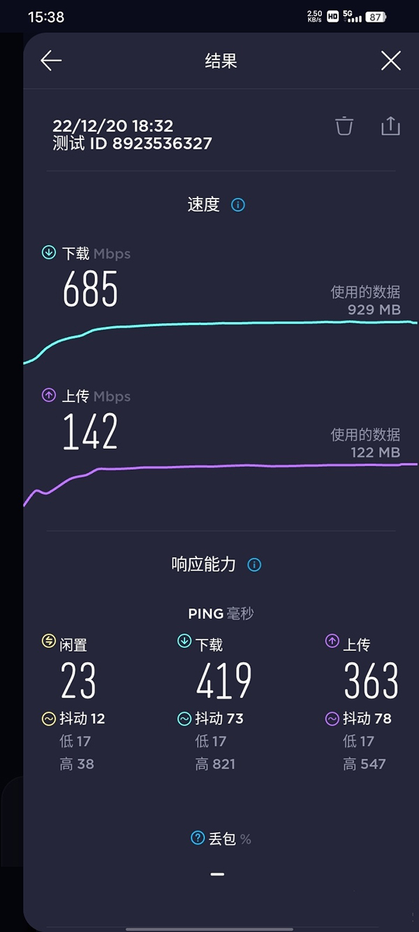 使用“Speedtest”對vivo Y35進行網(wǎng)速測試,結(jié)果如上圖所述,vivo Y35的5G下載峰值速度可以達(dá)到685Mbps,上傳峰值速度可以達(dá)到142Mbps。這意味著,使用vivo Y35緩存4K超清電影時,繼續(xù)數(shù)十秒,即可完成下載。