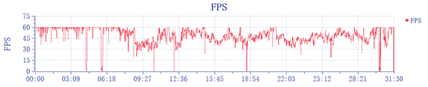 主要場景為跑圖做日常任務(wù),實測30分鐘下來,畫面流暢,操控順滑,機身微熱,平均幀率51。一開始跑圖時幀率基本穩(wěn)定在60幀,在戰(zhàn)斗場面出現(xiàn)比較大的波動,中間的0幀為傳送畫面切換。