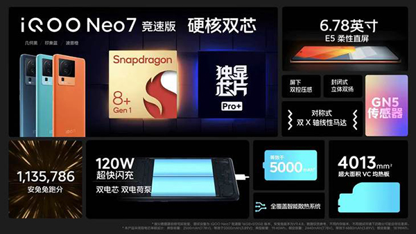 搭載了驍龍8+處理器的iQOO Neo7競速版,其安兔兔跑分為113萬分。