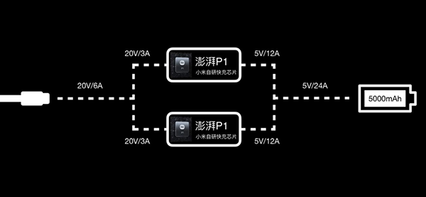 設(shè)計(jì)上,充電器端輸入的20V6A電壓電流傳輸至手機(jī)端后,輸入電流(20V6A)會(huì)分為2路,單路電壓電流分別為20V3A,分別經(jīng)過(guò)兩顆澎湃P1充電芯片4:1降壓升流至5V12A,再合流為一路5V24A電壓電流。