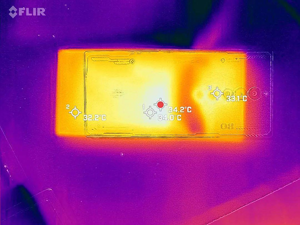 然后,離譜的機身溫度就出現(xiàn)。在連續(xù)30分鐘《原神》之后,紅魔8 Pro背面最高溫度僅34.2℃。好家伙,其他同為第二代驍龍8的手機,溫度都在45℃左右,足足低了11℃。即便考慮冬天偏冷的氣溫,這個機身溫度也是相當(dāng)可觀的。機身中框最高溫度33.9℃,正面屏幕的溫度會稍高一點,為39.4℃。所以說,紅魔8 Pro的被動散熱和風(fēng)扇確實有在發(fā)揮作用。