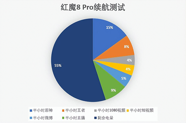 續(xù)航測(cè)試包括《原神》、《王者榮耀》、看1080P視頻、看短視頻、刷微博、看原畫直播,每個(gè)項(xiàng)目均30分鐘。最終,紅魔8 Pro剩余電量依然還有55%,作為一塊6000mAh的電池,55%的剩余電量也是相當(dāng)可觀的。