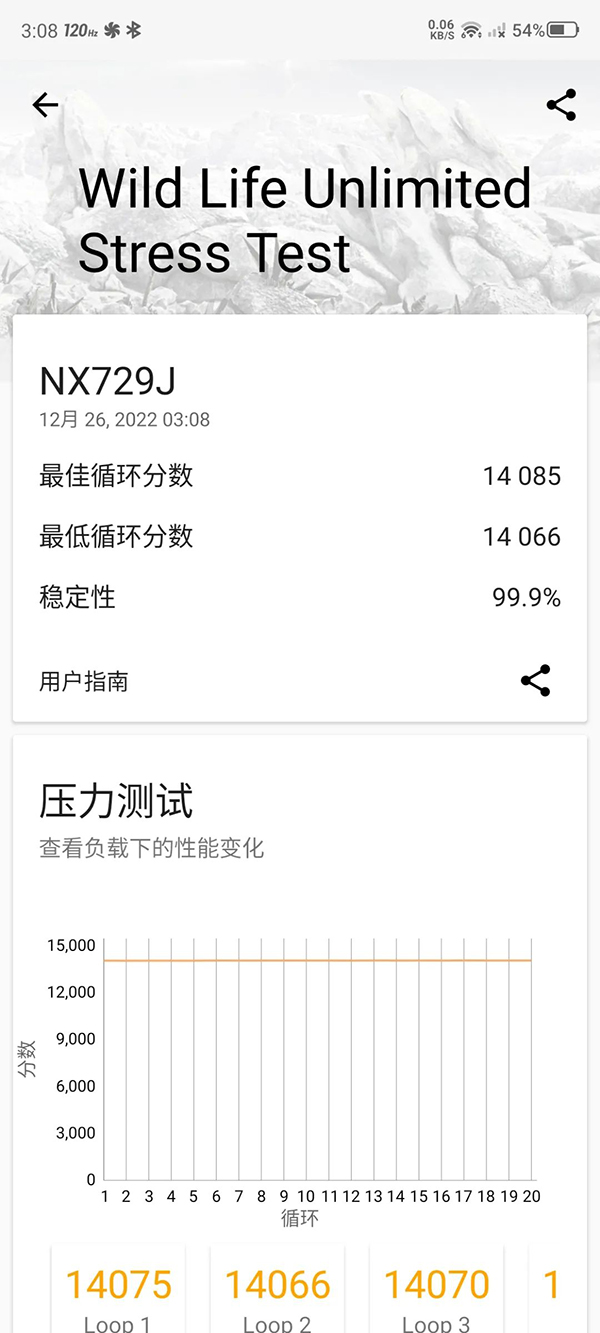 在3DMark壓力測試中,紅魔8 Pro最佳循環(huán)14085分,最低差距不大,為14066分,穩(wěn)定性達到99.9%,意味著該機不僅性能強,持續(xù)性能釋放穩(wěn)定且激進,沒有出現(xiàn)降頻,反饋到游戲上就是長時間的高幀高畫質(zhì)。iPhone14Pro這部分分數(shù)為12411分,穩(wěn)定性僅64.9%。