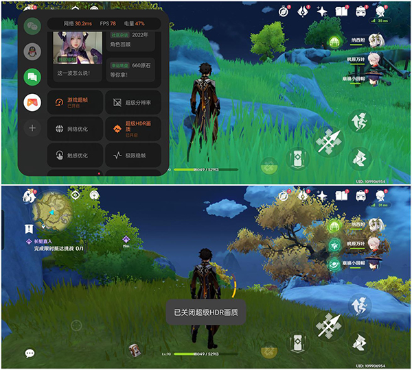一加11側(cè)邊小窗劃出之后支持開(kāi)啟超級(jí)分辨率、超級(jí)HDR畫質(zhì)、游戲超幀、極限穩(wěn)幀等各自游戲加強(qiáng)的調(diào)整,但并不能這幾項(xiàng)全部同時(shí)開(kāi)啟,我們?cè)跍y(cè)試的時(shí)候僅開(kāi)啟了游戲超幀和超級(jí)HDR畫質(zhì),HDR畫質(zhì)這項(xiàng)調(diào)整對(duì)于畫面的加持還是很明顯的,那就是草地的顏色瞬間就深了很多,是一些高飽和度黨的最愛(ài)。
