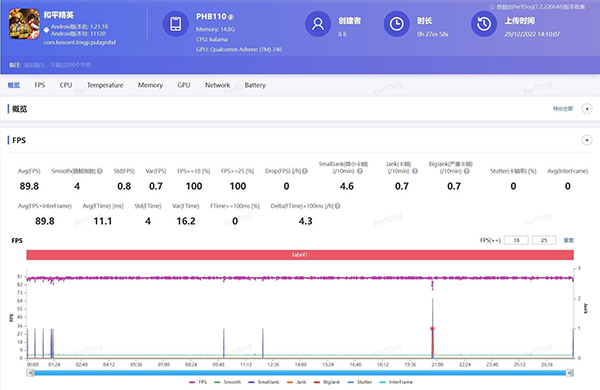 在游戲測試環(huán)節(jié),我們選擇了當下熱門《王者榮耀》《和平精英》《原神》三款游戲進行幀率測試。測試環(huán)境是24℃的室溫環(huán)境下,在游戲設置中將游戲畫質、幀率全部拉滿,并采用PerfDog記錄下游戲全程的幀率表現情況,結果如下: