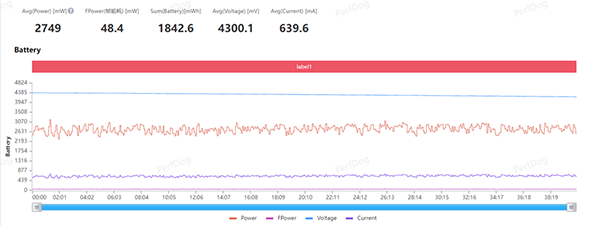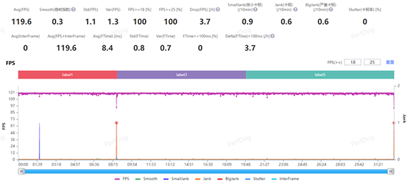 即便在《王者榮耀》極高幀率、超高分辨率、極致畫質(zhì)情況下,一加11連續(xù)3局之后,游戲的平均幀率119.6FPS,游戲幀率非常穩(wěn)定,功耗3.87W左右(1934.3mW*2)。
