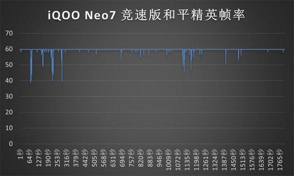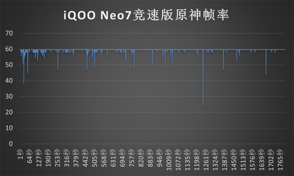 游戲測試自然少不了【原神】,【原神】對手機(jī)硬件過高的要求讓不少玩家望洋興嘆,紛紛表示在游玩【原神】時的游戲體驗非常糟糕。在此背景下,iQOO Neo7競速版沒有讓用戶失望,30分鐘【原神】并且開啟最高畫質(zhì)模式下,幀率表現(xiàn)讓人滿意,平均幀率穩(wěn)穩(wěn)地控制在59幀,哪怕在頻繁釋放大招也沒有掉幀情況。