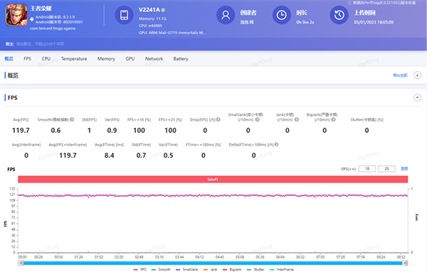 在實(shí)際的對局中,通過PerfDog記錄到的幀數(shù)為119.7幀,整個(gè)幀數(shù)曲線非常平直,vivo X90即使是在原生120幀的游戲設(shè)置中,對《王者榮耀》這一款熱門游戲的駕馭還是很強(qiáng)的。