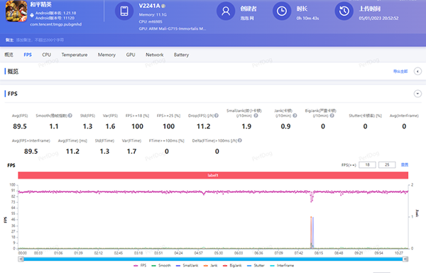 在PerfDog的技術(shù)支持下,筆者記錄到vivo X90的在《和平精英》中的平均幀數(shù)為89.5幀,整體的幀數(shù)曲線非常平直。而在幀數(shù)曲線中記錄到的一小段下降是由于筆者誤入活動(dòng)關(guān)卡重新跳傘切換視角所導(dǎo)致的。相信如果沒有中間這一個(gè)小插曲的話,vivo X90所能記錄到的平均幀數(shù)相信能夠更為優(yōu)秀。