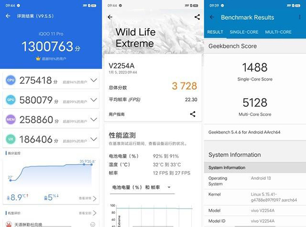 從跑分結(jié)果來看,iQOO 11 Pro安兔兔跑分可以達(dá)到130萬,其中GPU方面進(jìn)步明顯,跑分成績?yōu)?8萬,這意味著iQOO 11 Pro可以輕松駕馭各種大型手游。在3D Mark Wild Life Extreme的測試中,iQOO 11 Pro總體分?jǐn)?shù)3728,而在GeekBench中,iQOO 11 Pro的單核成績?yōu)?488,多核成績?yōu)?128。