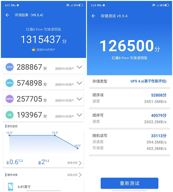 本次的16GB+512GB版本紅魔8 Pro+氘鋒透明版的跑分成績(jī)?yōu)?315437分,CPU成績(jī)?yōu)?88867,GPU成績(jī)?yōu)?74898;存儲(chǔ)測(cè)試中,隨機(jī)讀取速度為3451.5MB/s,隨機(jī)寫(xiě)入速度為2652.2MB/s,總成績(jī)?yōu)?26500分。