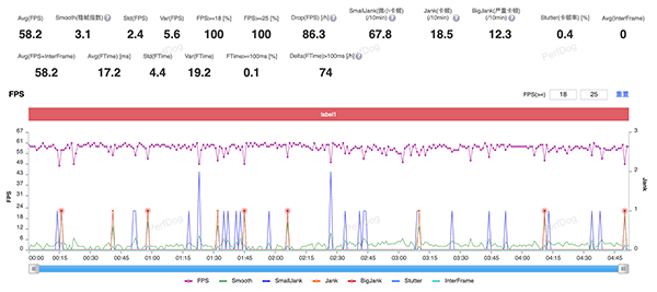 從曲線圖來看,Redmi K60還是難免會出現(xiàn)幀率的小幅波動,不過最終任然提供了58.2幀的高幀率和每10分鐘僅67.8次的微小卡頓、18.5次的卡頓和12.3次的嚴(yán)重卡頓。