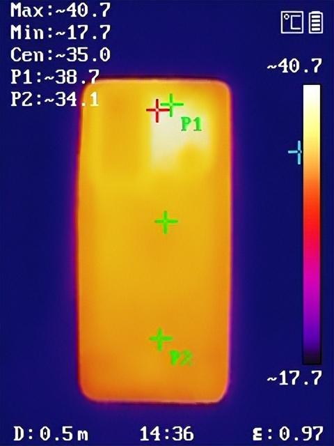 接著我們使用溫槍測量了手機表面溫度,可以看到峰值溫度回來到40.7℃,其余部分的溫度分布倒是相對比較均勻。