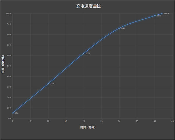 經(jīng)過我們的測(cè)試,從5%開始充電,10分鐘充電至33%,20分鐘充電至62%,半小時(shí)充電至86%,完全充滿用時(shí)42分鐘。