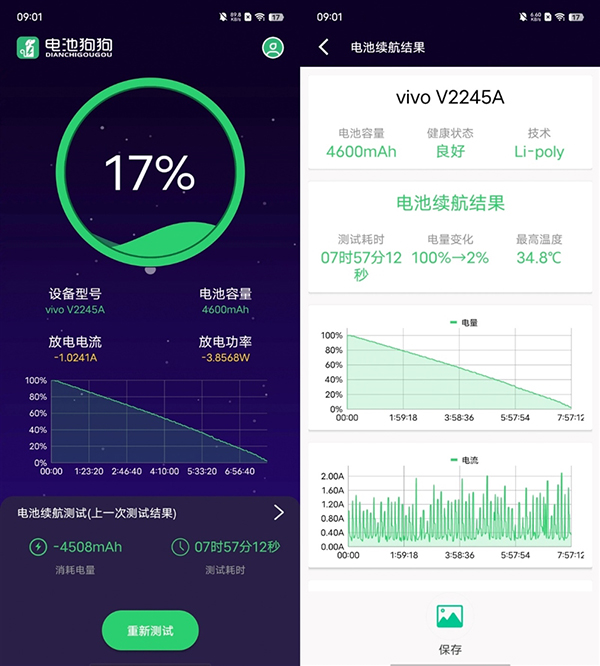 我們將vivo S16 Pro的屏幕刷新率更改為智能切換,亮度調(diào)節(jié)至50%并關(guān)閉自動(dòng)亮度,經(jīng)過硬件狗狗模擬日常應(yīng)用,電量從100%消耗至2%,耗時(shí)7小時(shí)57分鐘,接近8小時(shí)的續(xù)航能力足以應(yīng)對(duì)中度使用的用戶。