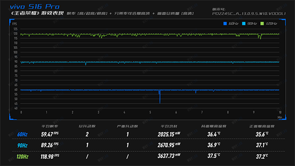S16 Pro在《王者榮耀》上的功耗和溫度的控制都做得不錯(cuò),60Hz模式平均能耗低至2W,120Hz也就3.6W,而游戲全程溫度未超38℃。