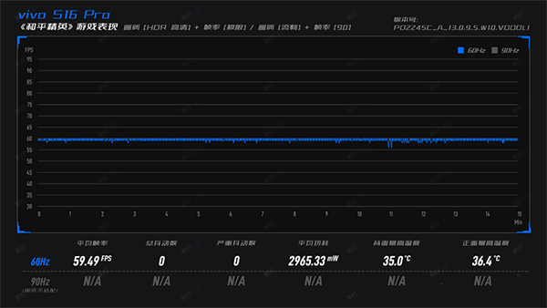 我們繼續(xù)由淺至深,看看游戲方面的表現(xiàn)——先看《王者榮耀》,三個(gè)幀率的表現(xiàn)都達(dá)到了旗艦的水平,59.47fps、89.26fps和118.98fps的平均幀率基本貼著滿幀跑的,不過60Hz和90Hz模式下分別錄得有1次較嚴(yán)重抖動(dòng),體感上基本可以忽略。