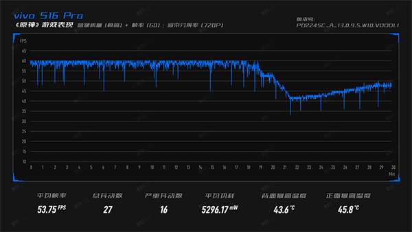 最后看性能需求最高的《原神》,渲染分辨率能達(dá)到720p,而平均幀率53.75fps的表現(xiàn)對這類定位的SoC來說,表現(xiàn)其實(shí)挺不錯(cuò)的,游戲前2/3過程的幀率基本都是頂著60fps跑的,但后面1/3的過程幀率回落到40fps~50fps,共計(jì)錄得16次較嚴(yán)重的畫面幀率抖動(dòng);游戲全程平均功耗5.2W,機(jī)身背面未超44℃;正面溫度控制在46℃以內(nèi),對輕薄向的手機(jī)而言,如此表現(xiàn)還算合理。