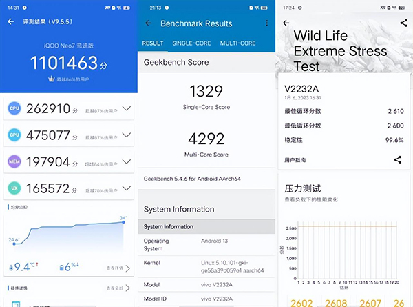 通過跑分我們可以看到相應(yīng)的表現(xiàn),在開啟系統(tǒng)資源調(diào)度更為激進,運行《王者榮耀》等游戲也會開放最高幀率的Monster模式后,iQOO Neo7競速版的安兔兔跑分成績來到了110萬分,GeekBench為單核1329、多核4292,考察GPU性能的3DMark測試中能有相當高的穩(wěn)定性。