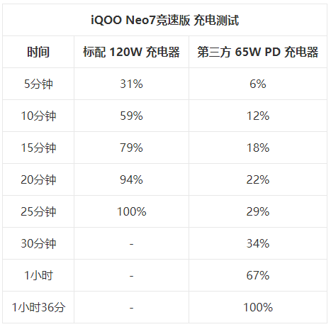 充電方面,iQOO Neo7競(jìng)速版配備了足夠讓人感到享受的120W有線快充。在18度室溫的情況下使用標(biāo)配120W充電器從1%開(kāi)始充僅需25分4秒手機(jī)即可顯示100%,并且在25分30秒左右時(shí)充電器功率低于可視為完全停止充電0.5W。