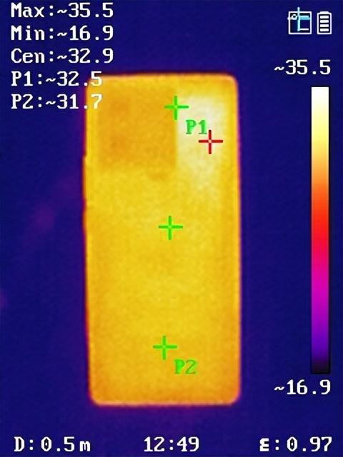 我們同時(shí)使用溫度槍測量了手機(jī)背部的溫度,可以看到SoC的高溫處也僅為35.5℃,并且整機(jī)的溫度分布也十分均勻。